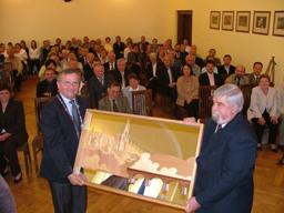 Silhouette Lohrs. Mieloch revanchierte sich mit einem Gemälde des Miliczer Stadtwappens. Winfried Bils überreichte dem Vorsitzenden des Miliczer Partnerschaftsvereins ein Ortsschild, auf dem die Entfernung