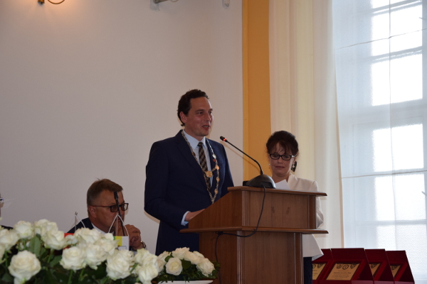 Festrede Bürgermeister Piotr Lech mit Dolmetscherin Marta Kaminska |