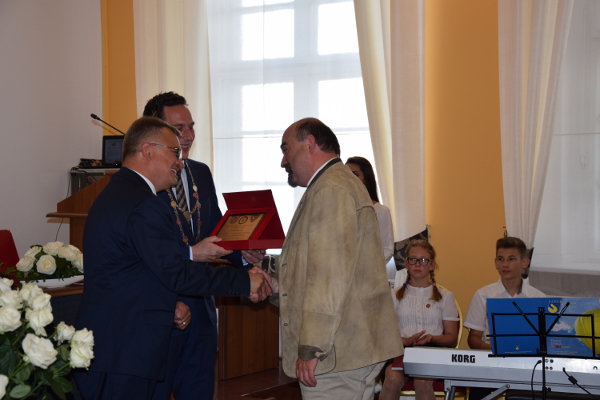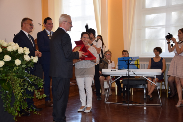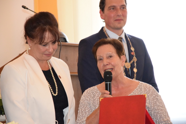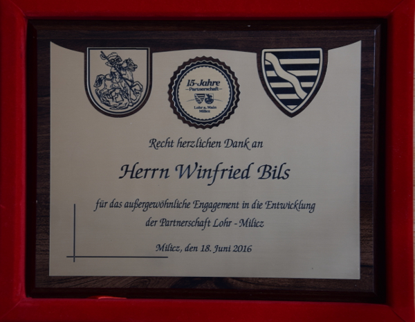 Winfried Bils für seinen unermüdlichen Einsatz für die Partnerschaft Lohr – Milicz. Die Verdiensttafel wurde von der Vorsitzenden des Lohrer Partnerschaftsvereins, Marianne Drexler entgegengenommen, da Bils nicht nach Milicz kommen konnte. »Sie sei glücklich und überwältigt, dass die Partnerschaft mit Milicz schon 15 Jahre Bestand hat.« so die Vorsitzende.