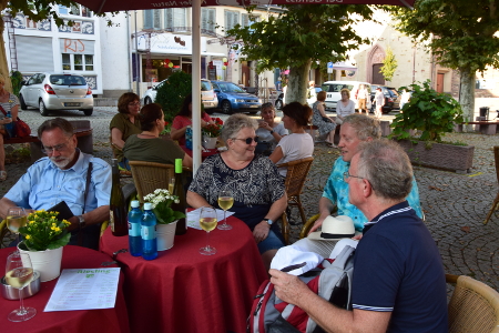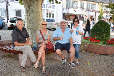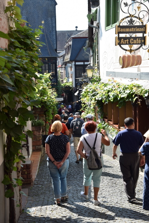 In Rüdesheim angekommen wurde die bekannteste Sehenswürdigkeit, die 144 Meter lange und 3 Meter breite Drosselgasse mit ihren Weinhäusern und zahlreichen Souvenirläden besucht. Da eine große Zahl weiterer Touristen die gleiche Idee hatten, war von Ruhe und Gemütlichkeit nichts mehr festzustellen. Die Schlussrast bei lokalem Rießling am schattigen Rüdesheimer Weinstand auf dem Marktplatz war genau das Richtige nach einem langen Tag.