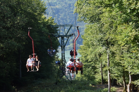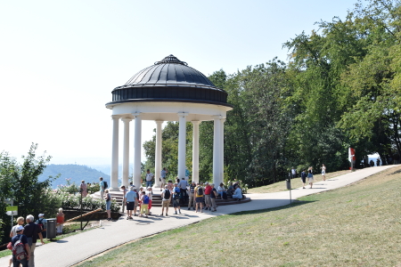 Das Niederwalddenkmal ist bequem mit der Kabinenseilbahn erreichbar und bietet eine herrliche Fernsicht ins Rhein- und Nahetal. Der Slogan „Über den Reben schweben“ trifft zu. Für den langen Wanderweg in Richtung Assmannshausen wurde man immer wieder belohnt durch einen schönen Rundblick auf den Hunsrück, den Rhein mit dem Mäuseturm und die Nahemündung, besonders von der künstlichen Ruine Rossel aus. Bei der anschließenden Talfahrt mit dem Sessellift an das Rheinufer nach Assmannshausen konnten die reiselustigen Mitglieder des Partnerschaftsvereins wieder entspannen. In die Ringtour eingeschlossen ist eine Schifffahrt nach Rüdesheim, die vorbeiführt an der Ruine Ehrenfels und dem Mäuseturm aus dem 14. Jahrhundert.
