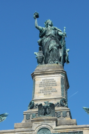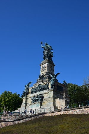 Hauptfigur ist die 12 Meter hohe Germania mit der Kaiserkrone in der erhobenen rechten und dem Reichsschwert in der linken Hand. Zwischen den Figuren Krieg und Frieden zeigt das Hauptrelief die beteiligten Persönlichkeiten, u.a, Kaiser Wilhelm I., Otto von Bismarck, Prinz Friedrich Wilhelm. Am Fuß des Sockels ist Vater Rhein abgebildet, der Tochter Mosel ein Signalhorn für die »Wacht am Rhein« überreicht und damit symbolisiert, dass der Rhein vom Grenzfluss zu einem innerdeutschen Fluss geworden ist.
