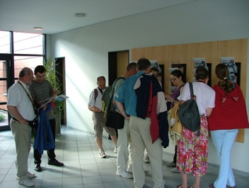 wird. Herr Bald führt die Gruppe durch die Glasausstellung im